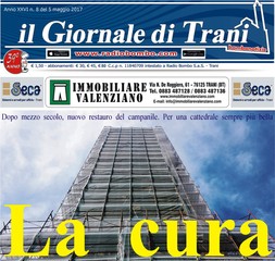 È in edicola a soli 1 euro e 50 il nuovo numero de "Il giornale di Trani", l'ottavo dell'anno. Il titolo è "La cura": è quella che sta riguardando il campanile della cattedrale di Trani, che è in fase di restauro dopo più di cinquanta anni.