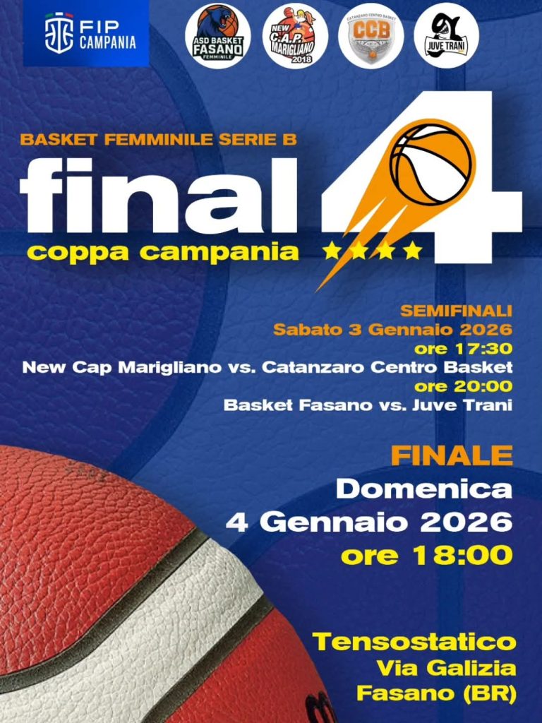 La formazione bianconera scenderà in campo nella seconda semifinale, in programma domani alle ore 20, affrontando Basket Fasano. Nell’altra semifinale, fissata alle 17:30, si sfideranno New Cap Marigliano e Catanzaro Centro Basket. La finale è prevista per domenica alle ore 18:00, sempre a Fasano.
