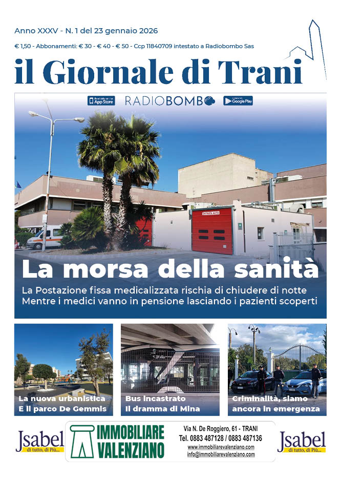 È in edicola il nuovo numero del «Giornale di Trani», 1ma uscita del 2026. Titolo di copertina, «La morsa della sanità»: la postazione fissa medicalizzata rischia di chiudere di notte, mentre i medici vanno in pensione lasciando i pazienti scoperti.