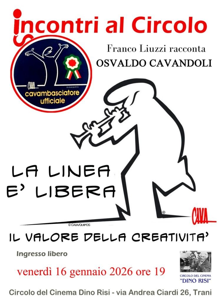 Il leggendario tratto di Osvaldo Cavandoli, il papà della celebre "Linea", sarà il protagonista del prossimo appuntamento di “incontri al Circolo”. Venerdì 16 gennaio 2026, alle ore 19:00, il Circolo del Cinema "Dino Risi" di Trani (via Andrea Ciardi, 26) ospiterà l’incontro dal titolo: "LA LINEA È LIBERA - Il valore della creatività".