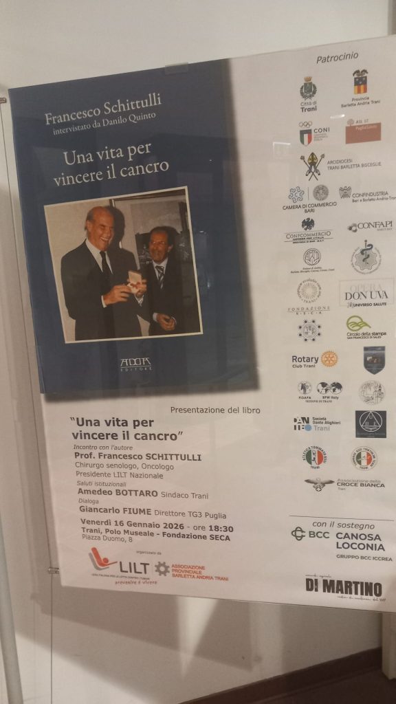 Un incontro all’insegna della cultura, della riflessione e della speranza quello che si è tenuto venerdì 16 gennaio al Polo Museale di Trani – Fondazione S.E.C.A., con la presentazione del libro “Una vita per vincere il cancro” del Prof. Francesco Schittulli (Adda, 2025). L’evento, promosso dalla LILT – Lega Italiana per la Lotta contro i Tumori – Associazione Provinciale BAT, ha offerto al pubblico un’occasione preziosa per conoscere da vicino il percorso umano e professionale di uno dei protagonisti della medicina italiana.