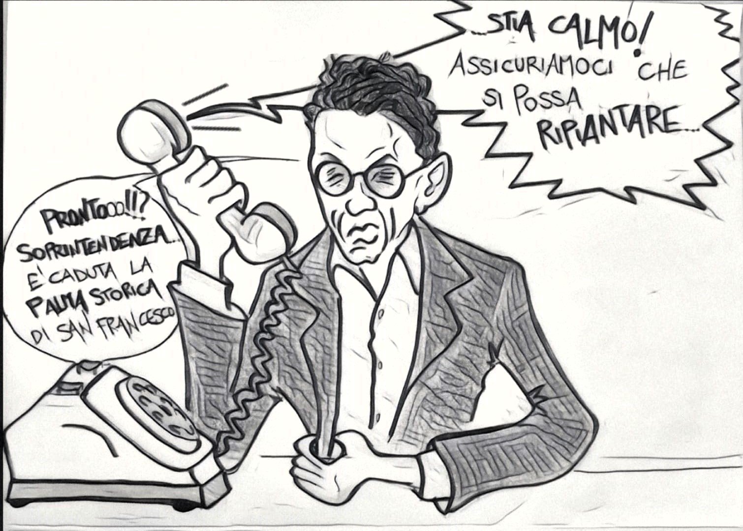 La vignetta coglie con ironia la polemica che ha caratterizzato i rapporti tra Comune e Soprintendenza sulla caduta della palma di San Francesco, assumendo una chiave satirica che prende in giro la burocrazia concentrata sull'impatto visivo estetico piuttosto che sulla sostanza. Un modo per alleggerire la tensione di questi giorni, in cui il dibattito si è fatto spesso aspro tra accuse, difese e scuse.