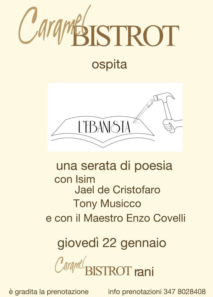 Giovedì 22 gennaio, alle ore 20:30, il Caramel Bistrò aprirà le sue porte a una serata speciale dedicata alla poesia, promossa dall’associazione L’EBANISTA, impegnata nella valorizzazione delle voci artistiche del territorio.
