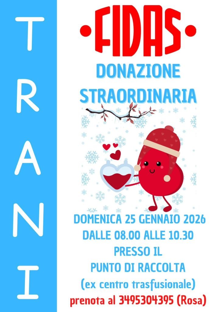 Un gesto semplice che può salvare una vita. Domenica 25 gennaio 2026, FIDAS Trani promuove una donazione straordinaria di sangue, rivolgendo un appello alla cittadinanza per rispondere concretamente a un bisogno costante e vitale.