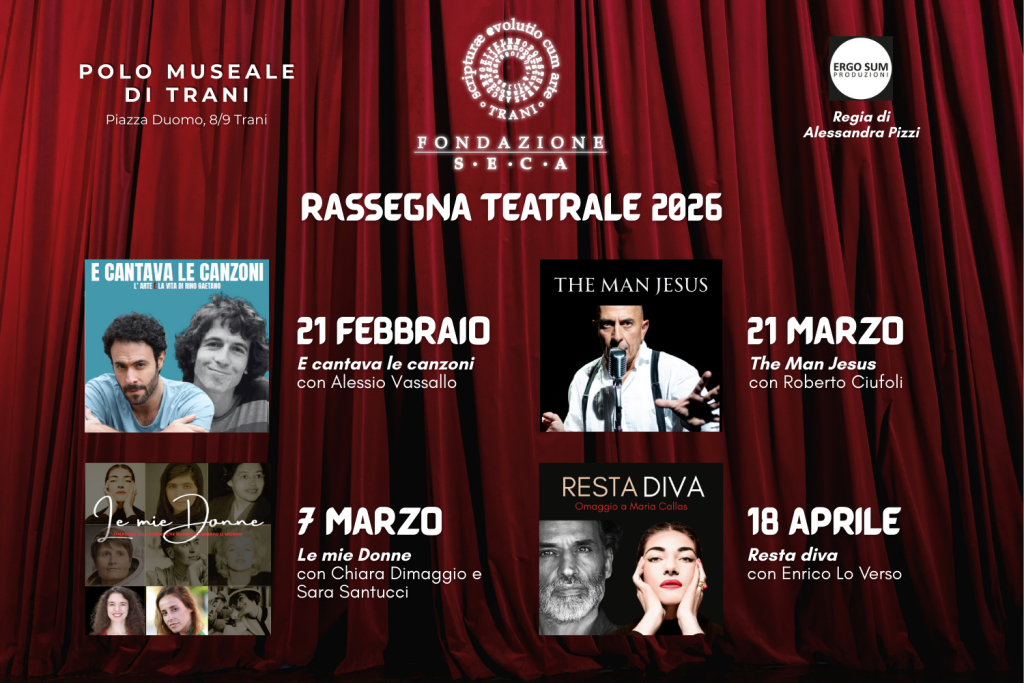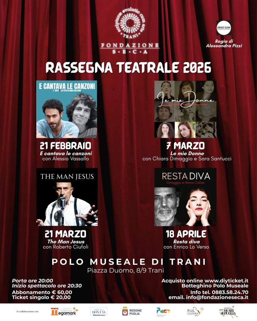 Nel suggestivo scenario del Polo Museale di Trani prende forma la Rassegna Teatrale 2026, un percorso artistico articolato in quattro appuntamenti che portano in scena linguaggi, visioni e poetiche del teatro contemporaneo, ideata da Fondazione S.E.C.A., aprendo la stagione artistica Fuori Museo 2026.