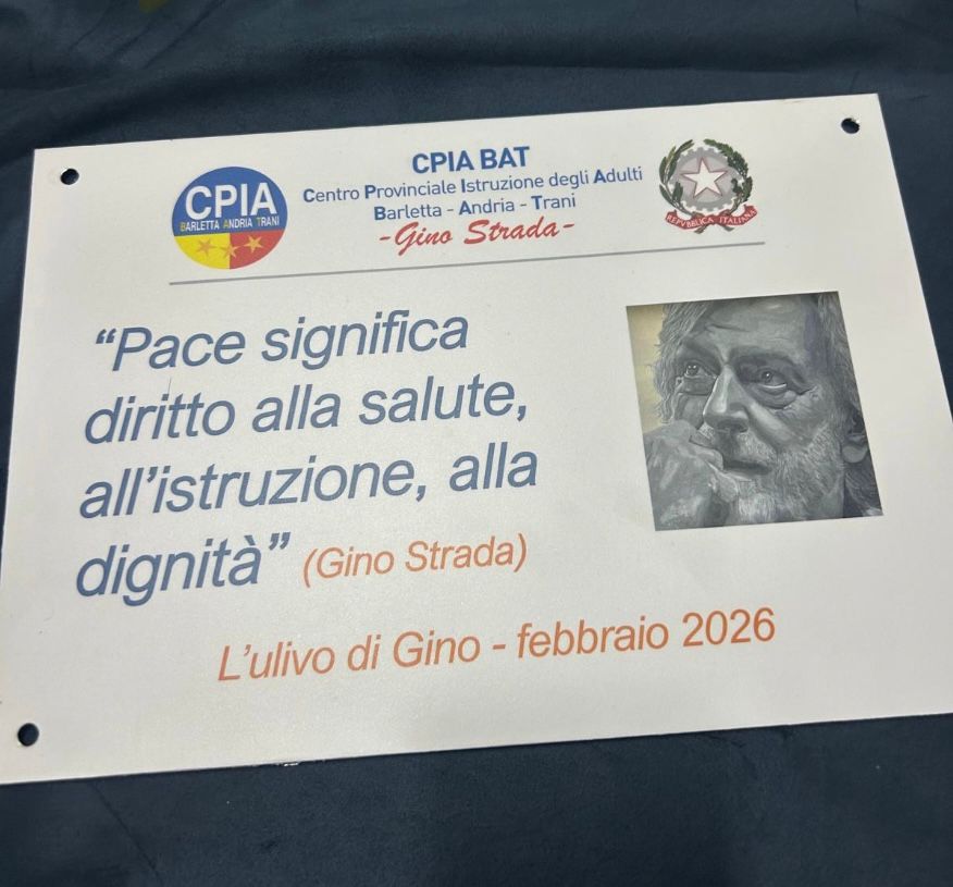Il CPIA BAT “Gino Strada”, guidato dal dirigente scolastico Paolo Farina, ha promosso una significativa iniziativa presso gli Istituti Penitenziari di Trani: la messa a dimora de “L’ulivo di Gino”, un albero dedicato alla memoria e al messaggio universale di pace, dignità, rispetto e salute che Gino Strada ha incarnato per tutta la sua vita.