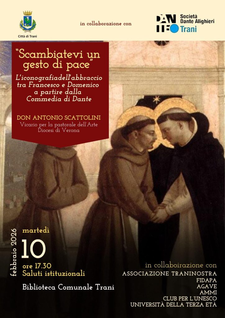 La conversazione, organizzata dal Comitato Dante Alighieri di Trani (in collaborazione con altre Associazioni),parte dalla riflessione sulla nota dantesca relativa a San Francesco: “…amore e maraviglia e dolce sguardo…” ( Pd. c. XI) e considera l’iconografia dell’abbraccio tra San Francesco e San Domenico, uno dei temi più significativi dell’arte sacra, che simboleggia l’unione di due carismi diversi al servizio della Chiesa.