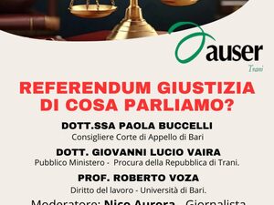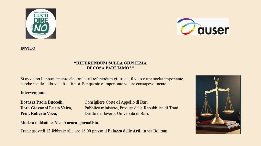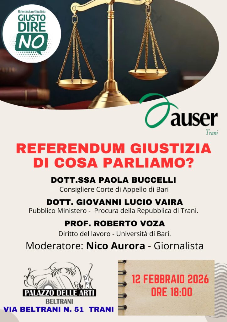 In vista del prossimo referendum sulla giustizia, il Comitato “Giusto dire NO”, in collaborazione con Auser ETS Trani, promuove un incontro pubblico per informare i cittadini sulle tematiche al centro del voto.