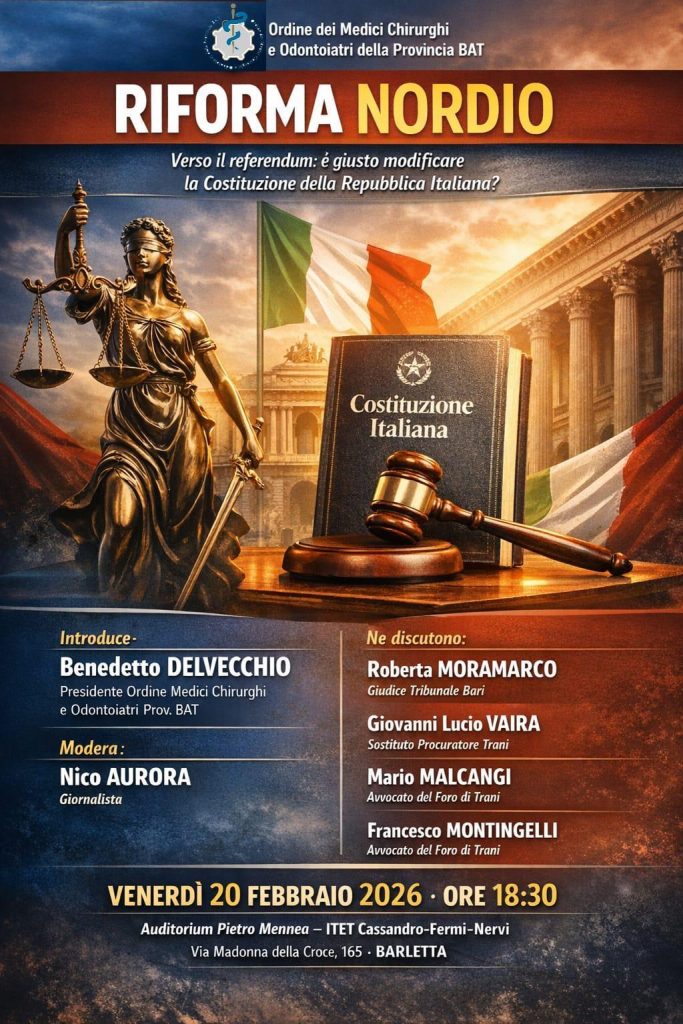 L 'Ordine dei Medici Chirurghi ed Odontoiatri della Provincia di Barletta Andria Trani organizza un incontro dal titolo “Riforma Nordio, verso il referendum. E' giusto modificare la Costituzione della Repubblica Italiana?” che si terrà a Barletta venerdì 20 febbraio alle 18:30 nell'auditorium Pietro Mennea Itett “Cassandro – Fermi - Nervi” in via Madonna della Croce 165.