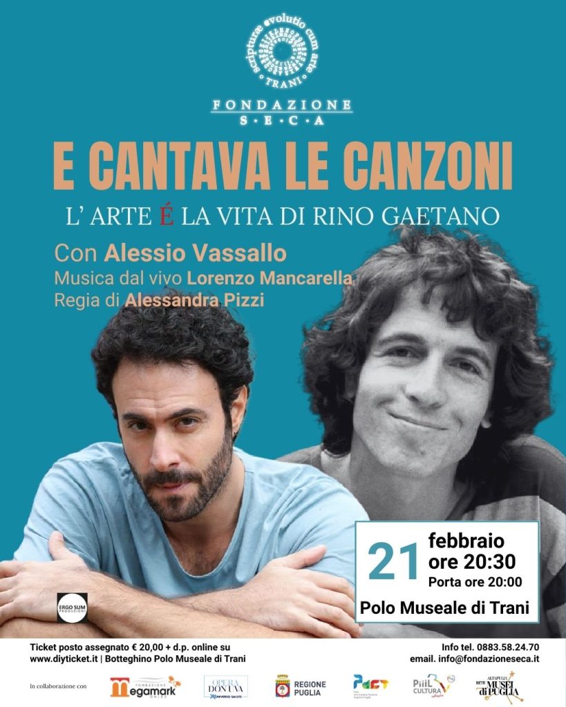 Dopo la rassegna natalizia “Sere d’Incanto”, ad aprire la stagione artistica “Fuori Museo 2026”, sarà Alessio Vassallo con lo spettacolo “E cantava le canzoni – L’Arte è la Vita di Rino Gaetano”, in scena sabato 21 febbraio 2026 alle ore 20:30 presso il Polo Museale di Trani – Fondazione S.E.C.A.