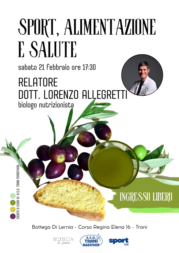 Prende il via domani “Sport Lab – Incontri di Benessere”, il nuovo progetto promosso da A.S.D. Trani Marathon con l’obiettivo di diffondere una maggiore consapevolezza sui temi dello sport, dell’alimentazione e della salute. Il primo incontro, in programma sabato 21 febbraio alle ore 17:30 presso la Bottega di Lernia (Corso Regina Elena 16), sarà dedicato al rapporto tra corretti stili di vita, nutrizione e attività sportiva, con ingresso libero e aperto a tutti.