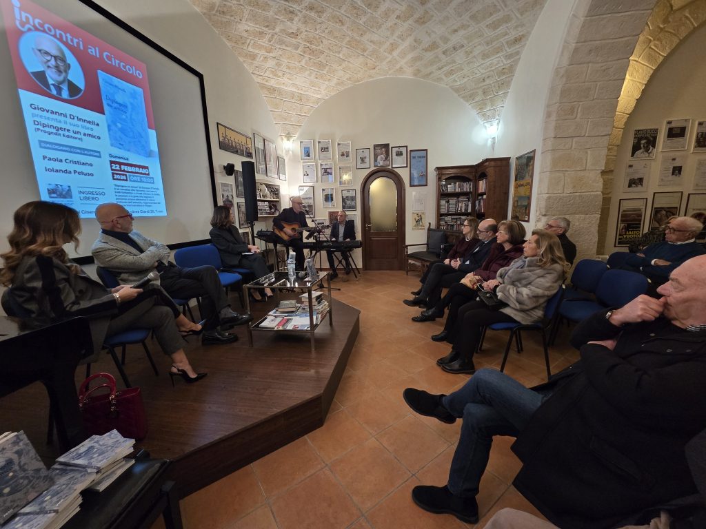 Presentato a Trani, presso il Circolo del Cinema «Dino Risi», il romanzo Dipingere un amico (Progedit) dell’avvocato e scrittore Giovanni D'Innella, nell’ambito della rassegna “Incontri al Circolo”, in un pomeriggio partecipato che ha unito letteratura, riflessione e arte.