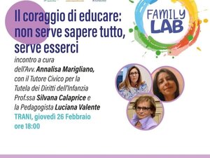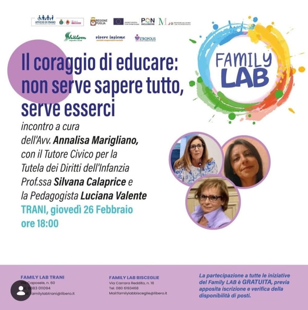 Si terrà giovedì 26 febbraio alle ore 18.00, a Trani, l’incontro dal titolo “Il coraggio di educare: non serve sapere tutto, serve esserci”, promosso nell’ambito delle attività del Family Lab, spazio di ascolto, orientamento e accompagnamento rivolto alle famiglie e alla comunità educante del territorio, gestito dall’ATI Coop. Soc. SHALOM (Capofila), Coop. Soc. VIVERE INSIEME e Consorzio METROPOLIS.