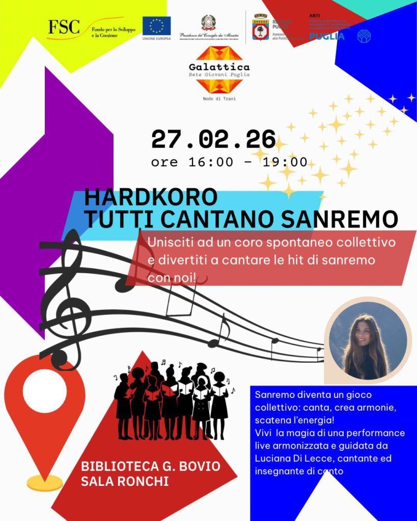 Venerdì, 27 febbraio – Cantare insieme, divertirsi e vivere l’energia di Sanremo in versione partecipativa: con “Tutti cantano Sanremo” arriva l’esperienza HardKoro, un format live pensato per un pubblico giovane (15–30 anni) che ribalta le regole del concerto tradizionale. Qui non si assiste: si partecipa. Il pubblico diventa un’unica voce, guidata da una vocal coach che condurrà il pomeriggio tra ritornelli iconici, momenti corali, call & response e un finale collettivo ad alto impatto.