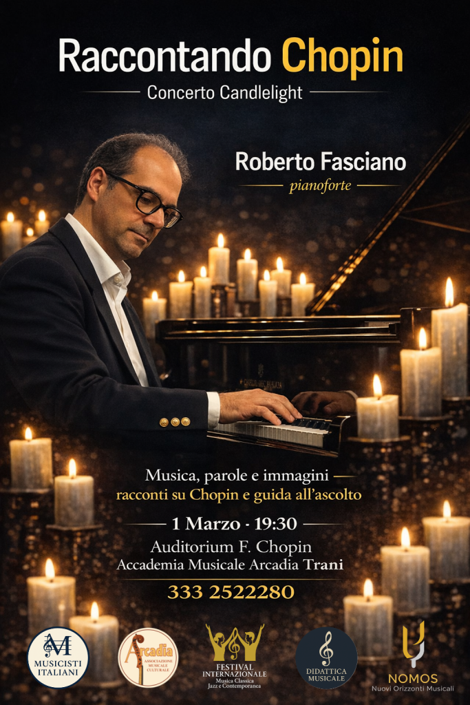 Sabato 1 marzo alle ore 19.30, presso l’Auditorium “F. Chopin” dell’Associazione Musicale e Culturale Arcadia, si terrà il concerto “Raccontando Chopin – Concerto Candlelight”, recital pianistico di Roberto Fasciano dedicato interamente a Frédéric Chopin nei giorni del suo anniversario di nascita.