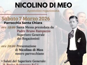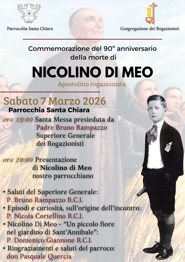 Nel 90^ anniversario della sua morte, la comunità parrocchiale di s. Chiara, per volere del parroco don Pasquale Quercia, sempre dedito alla riscoperta della santità locale sparsa di getto su tanti fronti, desidera riscoprire e rispolverare la figura del giovane Nicolino e di Padre Nicola Cortellino, rogazionista ed appassionato di questa testimonianza così viva nell'oggi. L'idea sorge per caso o per sana divina volontà, leggendo la storia del Di Meo sul sito "Santi e Beati", scoprendo che fosse un tranese ed inoltre parrocchiano di Ss. Agnese e Paolo (s. Chiara). Per questo, in data sabato 7 marzo '26, presso la parrocchia di s. Chiara, si terrà una celebrazione Eucaristica per commemorare il giovane apostolino rogazionista, ore 19.00, presieduta dal Superiore Generale dell'ordine rogazionista, Padre Bruno Rampazzo. Di seguito, alle ore 20.00 si svolgerà la Presentazione di Nicolino Di Meo, a più voci: Superiore (saluti iniziali), Padre N. Cortellino (episodi e curiosità sull'origine dell'incontro); P. Domenico Giannone R.C.I. (Nicolino Di Beo - "Un piccolo fiore nel giardino di Sant'Annibale"); Don Pasquale Quercia (ringraziamenti e saluti).