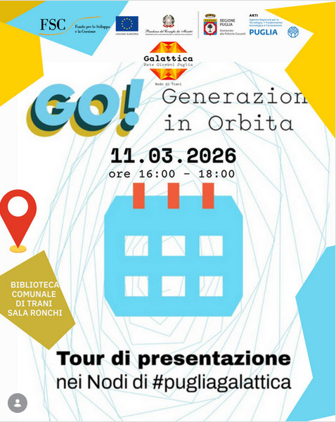 Si terrà a Trani, presso il Nodo Galattica della Biblioteca Comunale “Giovanni Bovio”, mercoledì 11 marzo alle ore 16, la presentazione della nuova misura di attivazione giovanile “GO! - Generazione in Orbita”, a cura della Sezione Politiche Giovanili della Regione Puglia, in collaborazione con ARTI - Agenzia Regionale per la Tecnologia, il Trasferimento tecnologico e l’Innovazione. La misura, con una dotazione finanziaria di 3 milioni di euro a valere su PR Puglia FESR -FSE+ 2021-2027, s’inserisce nel quadro delle attività previste dalla Legge Regionale sulle Politiche Giovanili e di “Galattica - Rete Giovani Puglia”, oggi la più grande opera di infrastrutturazione giovanile, materiale e immateriale, mai realizzata per offrire servizi ed opportunità dedicate alle giovani generazioni.
