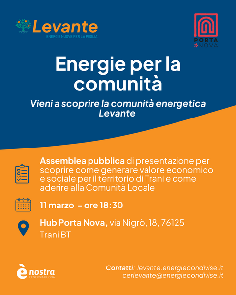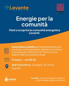 Un incontro informativo sulla nascente CER cittadina si terrà l’11 marzo, alle ore 18.30, presso l’Hub Porta Nova, via Nigrò 18, Trani.