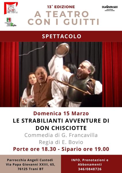 Lo spettacolo porterà sul palco una rilettura brillante e ironica delle celebri avventure del cavaliere errante, tra equivoci, situazioni comiche e personaggi pittoreschi che richiamano l’immaginario del grande classico della letteratura. Un’occasione per il pubblico di vivere una serata all’insegna del divertimento e della tradizione teatrale.
