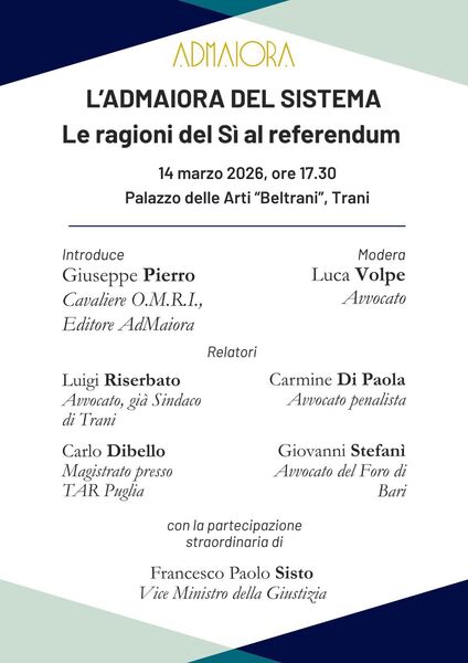 L’incontro dal titolo “L’Admaiora del sistema - le ragioni del Sì al Referendum”, ospita un confronto a più voci del mondo giuridico e intende accendere i riflettori su quelle che, per gli organizzatori, sono le motivazioni che sostengono una scelta orientata a rendere il sistema giudiziario più equo, efficiente e vicino ai cittadini. <<La giustizia rappresenta uno dei pilastri fondamentali dello Stato di diritto - ha detto il patron di Ad Maiora, cavaliere e ambasciatore di pace nel mondo Giuseppe Pierro. Il Sì rappresenta la scelta coerente con i principi costituzionali e con le esigenze di una giustizia moderna ed equilibrata. Per questo - ha concluso l’editore di Ad Maiora - si è reso necessario informare al meglio i cittadini, con autorevoli rappresentanti del mondo giuridico>>. Dopo l’introduzione e i saluti del dott. Pierro si confronteranno l’avv. Luigi Riserbato, già sindaco di Trani; il magistrato presso il TAR Puglia Carlo Dibello; Carmine Di Paola, avvocato penalista e Giovanni Stefanì avvocato del Foro di Bari. Il convegno sarà moderato dall’avv. Luca Volpe.