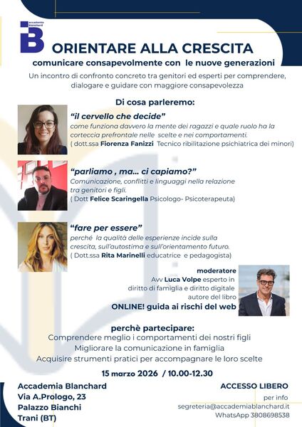 In un mondo in rapida trasformazione, comprendere le nuove generazioni non è mai stato così cruciale. L’Accademia Blanchard di Trani propone un incontro esclusivo dal titolo “Orientare alla crescita – comunicare consapevolmente con le nuove generazioni”, in programma domenica 15 marzo 2026, dalle 10:00 alle 12:30, presso Palazzo Bianchi, in via A. Prologo 23. L’evento, ad accesso libero, rappresenta un’occasione unica di confronto tra genitori ed esperti, pensata per fornire strumenti concreti di dialogo e orientamento educativo.