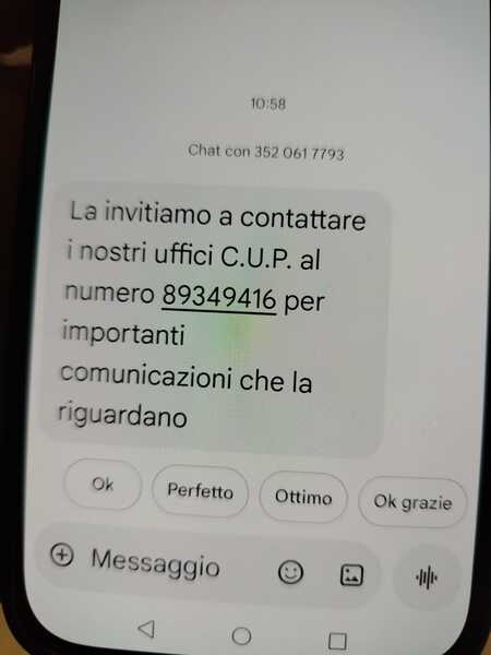 Una nuova ondata di tentativi di truffa sta circolando in queste ore attraverso messaggi che simulano comunicazioni ufficiali da parte degli uffici del Centro unico di prenotazione. Il testo invita l'utente a contattare con urgenza il numero 89349416 per presunte comunicazioni importanti che lo riguardano.