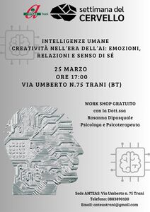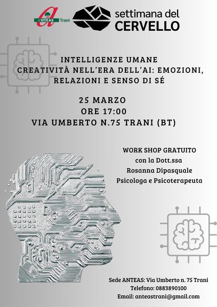 Intelligenze umane e creatività nell’era dell’AI Emozioni, relazioni e senso di sé In occasione della Settimana del Cervello 2026, l’Associazione Anteas Trani A.P.S. promuove un workshop psicologico esperienziale, condotto dalla Dott.ssa Rosanna Dipasquale Psicologa e psicoterapeuta, dedicato alle molteplici forme di intelligenza umana – emotiva, relazionale, narrativa e creativa – in dialogo con l’intelligenza artificiale. Viviamo in un tempo in cui l’intelligenza artificiale sta cambiando il modo in cui lavoriamo, comunichiamo e creiamo. Ma cosa ci rende ancora profondamente umani? Attraverso riflessioni guidate e brevi attività esperienziali, l’incontro offrirà uno spazio di confronto e condivisione per esplorare: emozioni e memoria creatività e immaginazione relazioni e senso etico identità e senso di sé nell’era digitale.