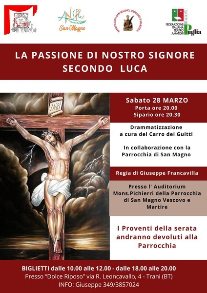 Sabato 28 marzo, la storia più potente e intensa della cristianità prenderà forma sul palco dell’Auditorium Mons. Pichierri della Parrocchia di San Magno Vescovo e Martire, grazie alla drammatizzazione de “La Passione di Nostro Signore secondo Luca”. L’evento, a cura del gruppo teatrale Carro dei Guitti, promette di offrire un’esperienza emozionante e immersiva per tutta la comunità.