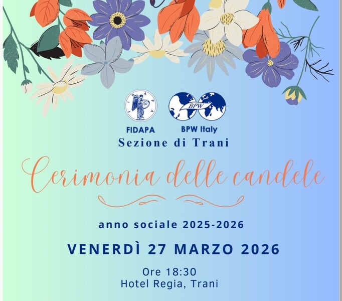 Si terrà venerdì 27 marzo 2026 alle ore 18,30 presso Palazzo Filisio in Trani l’evento della “Cerimonia delle Candele” per la federazione FIDAPA BPW Italy sezione di Trani.