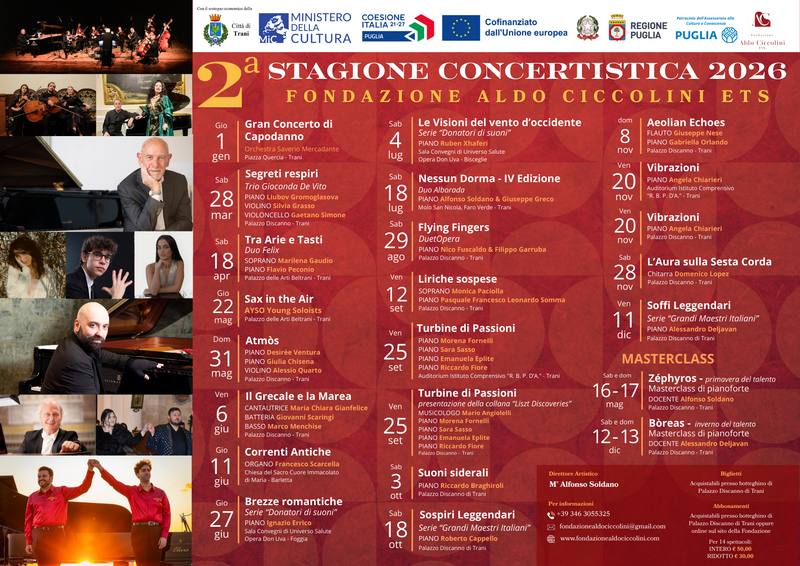 Ideata dal direttore artistico M° Alfonso Soldano e promossa dalla Fondazione Aldo Ciccolini ETS, con il sostegno del Ministero della Cultura e in collaborazione con il Centro Artistico Musicale “Paolo Grassi” di Martina Franca, la rassegna nasce con l’obiettivo di creare un dialogo autentico tra musica, spazio e ascolto, trasformando ogni concerto in un’esperienza condivisa.