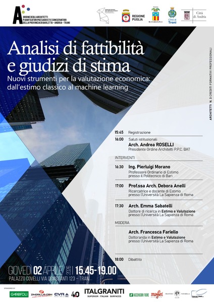 Giovedì 2 aprile 2026 a partire dalle 16 a Palazzo Covelli in via Ognissanti 123 a Trani ci sarà il convegno “Analisi di fattibilità e giudizi di stima — Nuovi strumenti per la valutazione economica: dall'estimo classico al machine learning”, promosso dall'Ordine degli Architetti Pianificatori Paesaggisti e Conservatori della provincia di Barletta-Andria-Trani.
