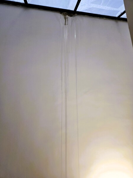 Lungo i corridoi del salone sono stati infatti posizionati dei recipienti per raccogliere l’acqua piovana che cadeva copiosamente dall’alto. Le infiltrazioni erano visibili anche lungo una parete laterale delle scale, segno evidente di un problema che non appare occasionale, ma piuttosto strutturale e aggravatosi nel tempo.