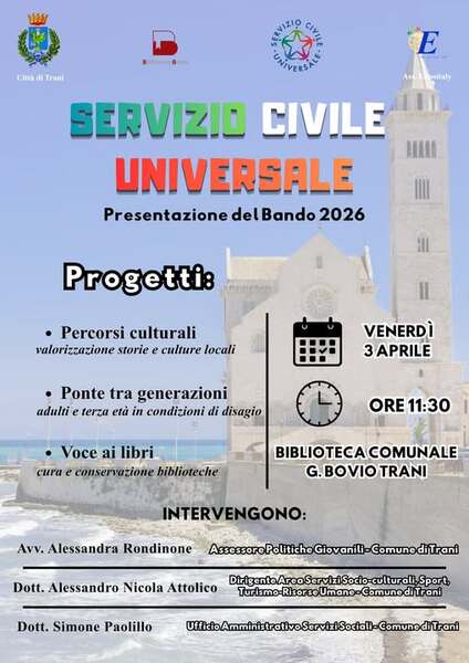 Si terrà domani, 3 aprile, alle ore 11.30, presso la Biblioteca Comunale Giovanni Bovio di Trani, l'incontro pubblico volto alla presentazione delle opportunità offerte dal Bando per la selezione di 65.964 operatori volontari da impiegare in progetti afferenti a programmi di intervento di Servizio Civile Universale da realizzarsi in Italia e all’estero.