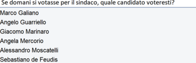 I risultati sono calcolati su un totale di n. 629 questionari compilati (escludendo i non tranesi e chi ha dichiarato apertamente di non voler votare) e sono presentati solo in forma aggregata (percentuali di risposta e numero complessivo di partecipanti).