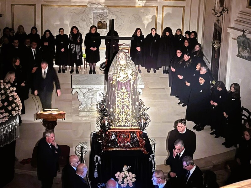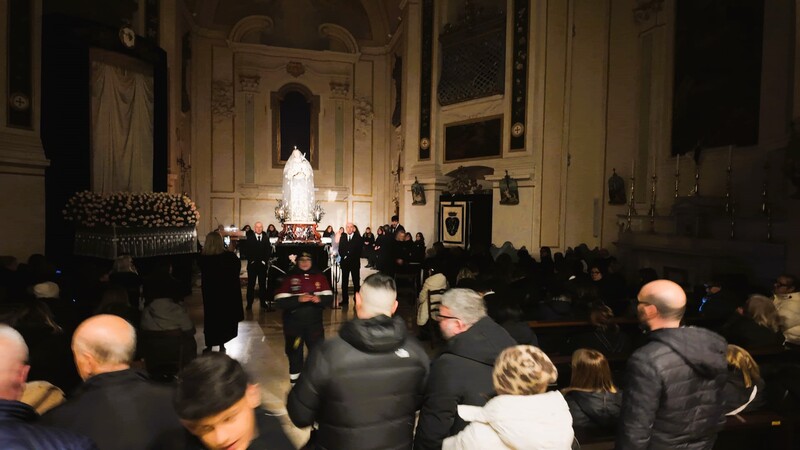 Se la Madonna non è andata dai fedeli, sono stati i fedeli ad andare dalla Madonna. La chiesa di Santa Teresa, nonostante la processione annullata, è stata gremita quasi sempre: chi non ha voluto rinunciare all'appuntamento con la Vergine Addolorata ha scelto di raggiungerla lì dove si trovava, al centro del presbiterio, al riparo dalla pioggia che pure non accennava a smettere. Un gesto spontaneo, quello dei fedeli, che ha detto molto del legame profondo che unisce questa comunità alla sua devozione. Niente corteo, niente banda, niente candele lungo il percorso: eppure la chiesa non ha mai smesso di accogliere devoti.