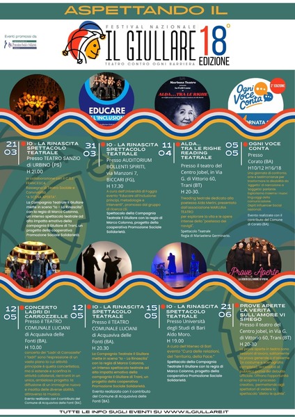 La rassegna, quest'anno tocca diverse città e coinvolge Scuole, Enti e Fondazioni, con un programma intenso partito con lo spettacolo “IO-La Rinascita” della nostra Compagnia Teatrale Il Giullare andato in scena il 21 marzo scorso nella prestigiosa cornice del Teatro Raffaello Sanzio di Urbino, grazie alla preziosa collaborazione del Gruppo Teatro “Accua” del CSE Francesca” di Urbino e proseguito Martedì 31 Marzo nell’Auditorium Bollenti Spiriti di Biccari (FG) grazie alla collaborazione del Learning Science Institute dell’Università di Foggia.