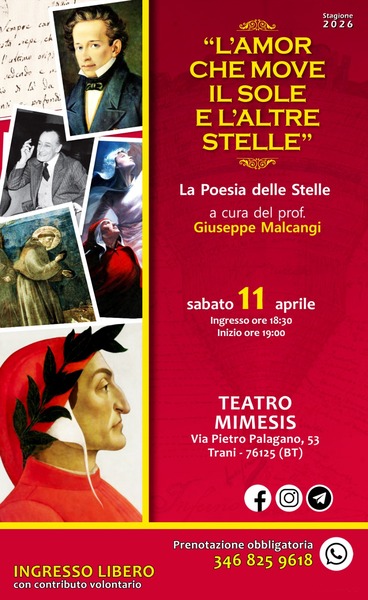 Sabato 11 aprile, presso il Teatro Mimesis, andrà in scena “L’amor che move il sole e l’altre stelle”, un percorso poetico guidato dal Prof. Giuseppe Malcangi, che accompagnerà il pubblico in un itinerario emozionale attraverso alcune delle voci più alte della letteratura italiana.