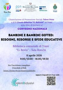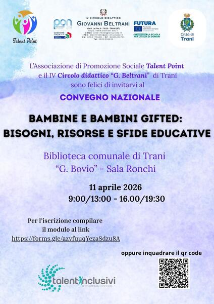 L'Associazione Talent Point e il IV Circolo Didattico G. Beltrani, in collaborazione con la Città di Trani, promuovono un importante momento di confronto e approfondimento dedicato al mondo della plusdotazione.