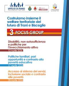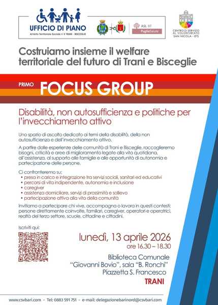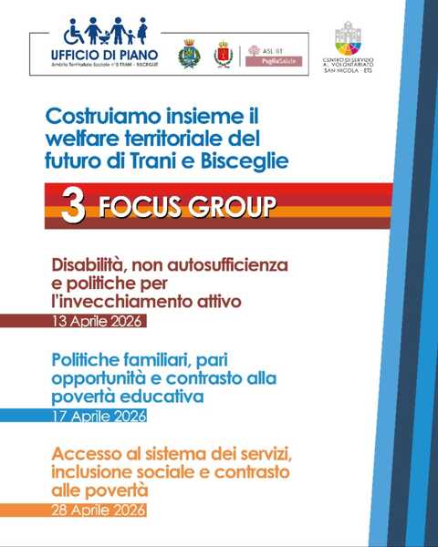 All’interno del progetto di welfare partecipato organizzato dall’Ambito Territoriale Sociale di Trani e Bisceglie in collaborazione con il Centro di Servizio al Volontariato San Nicola ETS, è previsto un percorso di ascolto della comunità attraverso 3 focus group dedicati ai diversi ambiti del sociale. A partire dalle esperienze delle collettività di Trani e Bisceglie, verranno raccolti bisogni, criticità e aree di miglioramento, per costruire insieme un welfare più vicino alle persone.