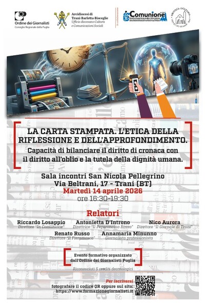 In un panorama informativo segnato dalla velocità del digitale e dal fenomeno dell’infodemia, l'approfondimento giornalistico su carta non rappresenta solo una scelta di supporto, ma un rigoroso metodo professionale regolato da precise norme etiche. Per analizzare questa funzione cruciale, l’Ufficio Cultura e Comunicazioni Sociali dell’Arcidiocesi di Trani - Barletta- Bisceglie, in collaborazione con l’Ordine dei Giornalisti Puglia, il mensile In Comunione e la Biblioteca diocesana “Arcivesvovo Giovanni, ha organizzato per il prossimo 14 aprile 2026, dalle ore 16:30 alle 19:30, un incontro di formazione presso il la Sala incontri San Nicola Pellegrino 17, Trani