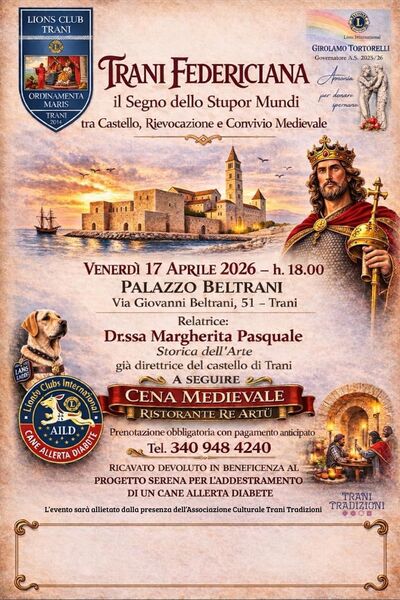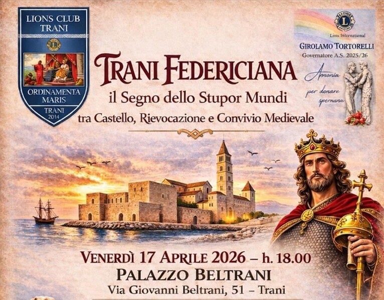 Il Lions Club Trani, in collaborazione con l'Associazione Culturale Trani Tradizioni, annuncia l'evento "Trani Federiciana: il Segno dello Stupor Mundi, tra castello, rievocazione e convivio medievale” che si terrà venerdì 17 aprile 2026 alle 18.00 presso Palazzo Beltrani, via Giovanni Beltrani, 51 - Trani e a seguire presso il Ristorante Re Artù.
