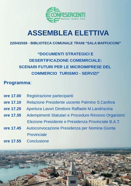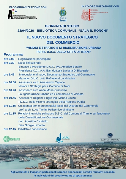 Trani si prepara ad ospitare una giornata ricca di appuntamenti, in biblioteca, suddivisa in due segmenti nella giornata di mercoledì 22 aprile a partire dalle ore 9.00, per un confronto a più voci sul momento di profondo cambiamento che sta interessando il commercio a livello globale organizzata dal Distretto Urbano del Commercio di Trani con la coorganizzazione degli Ordini professionali di Architetti ed Ingegneri, impegnati nella prima parte del dibattito, con un parterre di ospiti illustri che discuteranno delle strategie e delle soluzioni possibili per il futuro del commercio di prossimità partendo dai due temi principali: la desertificazione commerciale e il documento strategico del commercio del Comune di Trani.