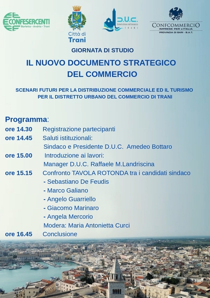 Nel primo pomeriggio, dopo un brunch ristorativo, sarà la volta del confronto tra De Feudis, Galiano, Guariello, Marinaro e Mercorio, i cinque candidati sindaco al Comune di Trani, chiamati a rispondere sugli stessi temi discussi in mattinata e ad illustrare progetti e programmi sullo scenario commerciale e turistico della comunità che ambiscono a governare. Moderato da Maria Antonietta Curci, il dialogo sarà introdotto da un focus particolare sulla distribuzione commerciale e il distretto urbano del commercio della città a cura del manager Raffaele M. Landriscina.