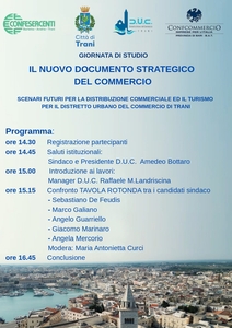 Sarà poi il dott. Landriscina a presentare il nuovo Documento strategico del commercio del Comune di Trani, coinvolgendo nel dibattito l’assessore Capone e il sindaco, oltre a rappresentanti del governo regionale e Agostino Ciciriello e Giorgio Limonta, i tecnici della squadra tecnica incaricata della redazione del DSC da parte del DUC, e con gli interventi dell’architetto Ricchiuto e dell’immobiliarista De Toma, che dialogheranno con il pianificatore Limonta e Luca Tamini, professore del Politecnico di Milano, voce tecnica e autorevole che arricchirà la discussione sulle progettualità locali dei Distretti del Commercio, introducendo misure specifiche per il centro storico, la regolazione delle medie strutture di vendita, la tutela del commercio di prossimità e il miglioramento della qualità urbana.