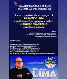 Sabato 18 aprile alle 18.30, presso l'Ibis Hotel in corso Imbriani 135, si terrà un incontro elettorale a sostegno di Raimondo Lima, candidato al Consiglio comunale, e di Angelo Guarriello, candidato sindaco.