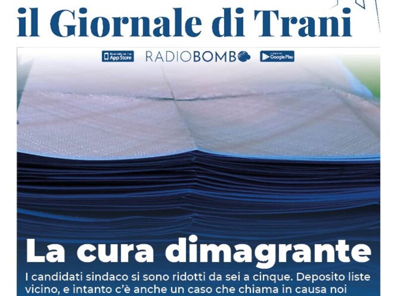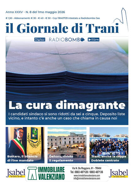 È disponibile in edicola l'ottavo numero del 2026 del Giornale di Trani, che apre con il titolo di copertina «La cura dimagrante». Al centro del dibattito politico cittadino vi è la riduzione dei candidati alla carica di sindaco, passati da sei a cinque mentre si avvicina il termine per il deposito delle liste. Il numero affronta inoltre una questione che vede coinvolta direttamente la redazione.