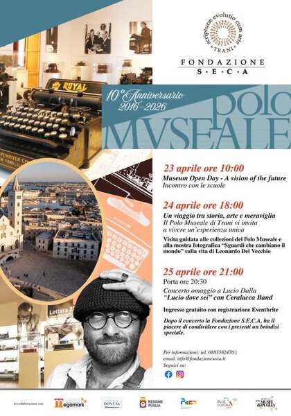 In occasione del decimo anniversario dalla sua istituzione (2016–2026), il Polo Museale di Trani - Fondazione S.E.C.A. propone un articolato programma di eventi che intreccia storia, arte, tecnologia e musica, delineando un percorso culturale che si estende dal 23 al 25 aprile e coinvolge scuole, cittadini e visitatori in una riflessione condivisa sul valore della memoria e della creatività.