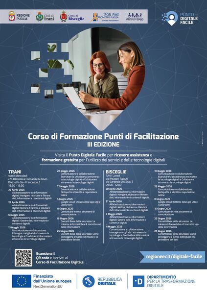 L’Ambito Territoriale Sociale n. 5 Trani – Bisceglie comunica che, a seguito della ripresa del servizio di facilitazione digitale, prende avvio anche la fase strutturata di formazione rivolta alla cittadinanza, con un calendario di incontri programmati presso le sedi di Trani e Bisceglie.