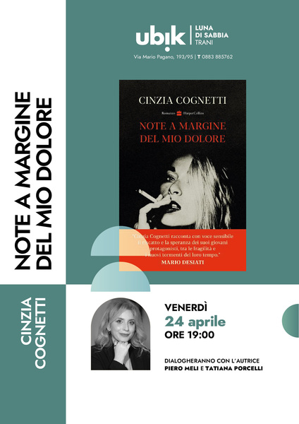 Venerdì 24 aprile ore 19:00 Luna di sabbia Ubik presenta Cinzia Cognetti "Note al margine del mio dolore" edito HarperCollins.