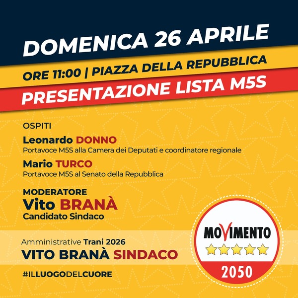 Nel corso dell’iniziativa sarà ufficialmente presentata la lista del Movimento 5 Stelle per le amministrative di Trani 2026, in un momento politico particolarmente significativo per il gruppo locale, che ha deciso di intraprendere un percorso autonomo dopo la fine del confronto con le altre forze progressiste. La candidatura di Vito Branà si pone così al centro di un progetto che punta a rafforzare un’identità chiara e riconoscibile.